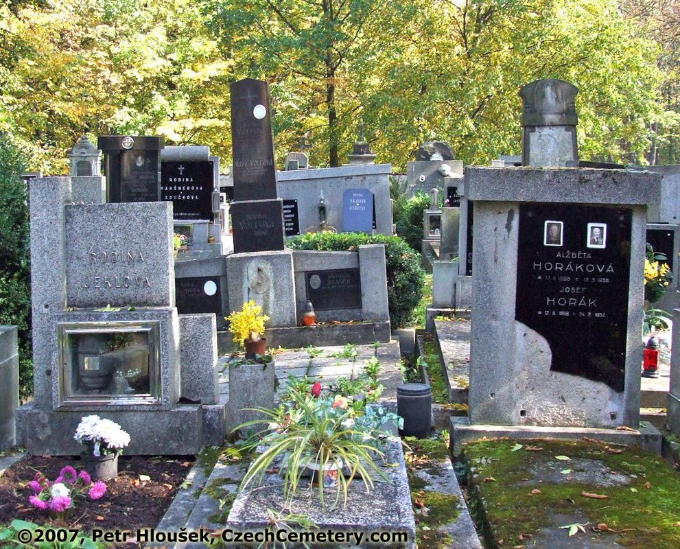 Left: | Middle: Josef Šrotýř, *5.2.1908 - †27.11.1988 | Right: Alžběta Horáková, *17.11.1888 - †13.3.1938 Josef Horák, *12.8.1868 - †24.2.1952 | Neighbouring graves: Anička Volfová, *3.3.1905 - †26.12.1927 Antonín Staněk, *1.9.1901 - †11.2.1936 Anna Hájková, *2.1.1857 - †7.10.1937 |