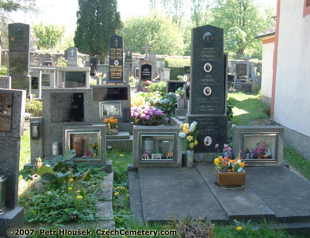 Links: | Rechts: Jan Pomahač, *12.11.1852 - †1.6.1935 manželka Anna Pomahačová, *30.10.1864 - †28.7.1935 František Řezníček, *30.4.1887 - †19.3.1955 František Špaček, *Unlesbar - †Unlesbar |
