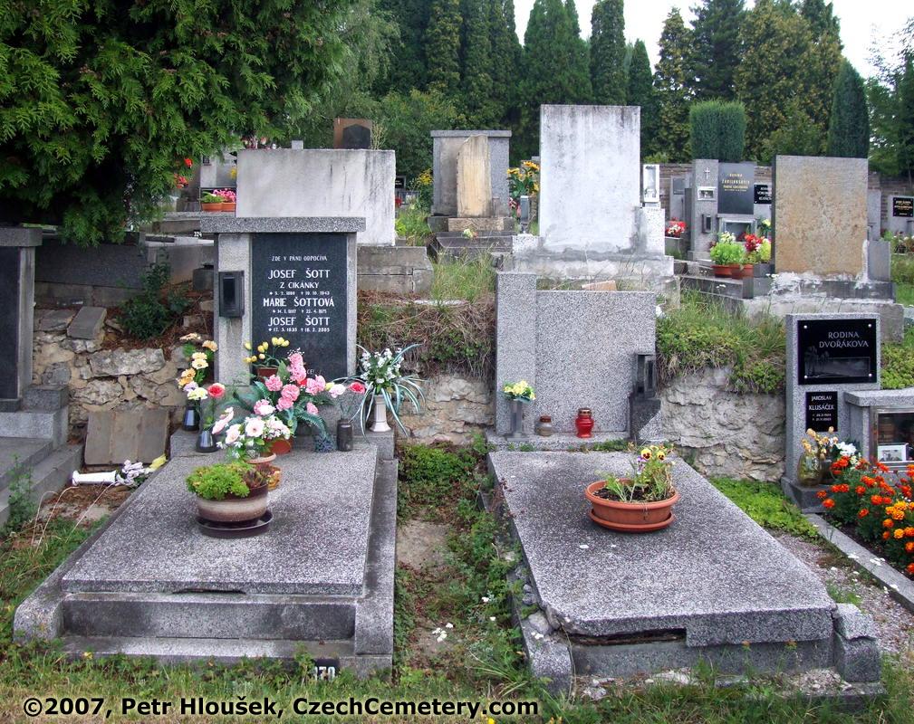 Left: Josef Šott, z Cikánky, *5.2.1898 - †19.10.1943 Marie Šottová, *14.1.1897 - †22.4.1975 Josef Šott, *17.3.1935 - †16.2.2005 | Right: Unreadable | Neighbouring graves: Jaroslav Klusáček, *26.3.1924 - †21.11.2003 Josef Dvořák, *16.3.1905 - †16.9.1976 Věra Klusáč, *23.2.1930 - †4.3.2003 |