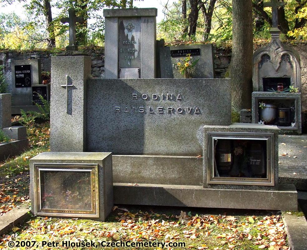 Vprostřed: Josef Raisler, *26.11.1902 - †17.3.1976 | Okolní náhrobky: Ing. Václav Důbrava, tragicky zemřel, †8.6.1960 (27) |