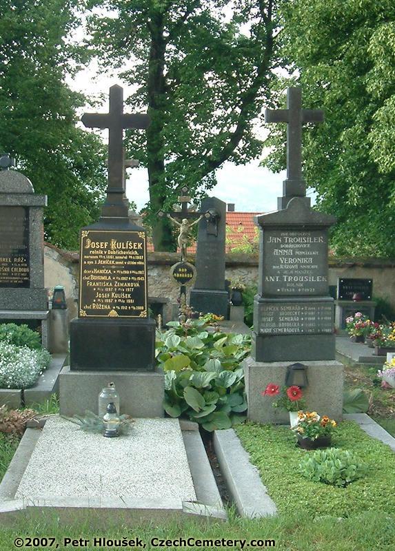 Vlevo: Josef Kulíšek, rolník v Dobřichovicích, *22.5.1861 - †20.7.1907 Jeníček Kulíšek, syn, zemřel v útlém věku Hanička Kulíšková, dcera, *25.9.1901 - †26.12.1917 Bohumila Kulíšková, choť, *12.4.1867 - †22.2.1943 Františka Zemanová, *18.11.1897 - †21.6.1977 Josef Kulíšek, *16.3.1907 - †28.12.1981 Růžena Kulíšek, choť, *14.8.1912 - †23.6.2000 | Vpravo: Antonín Trousílek, rolník, *24.12.1838 - †11.2.1927 Pepíček Semerád, *19.9.1944 - †13.11.1948 Josef Semerád, *22.2.1908 - †26.9.1968 Aloisie Brodecká, *4.11.1883 - †13.2.1973 |