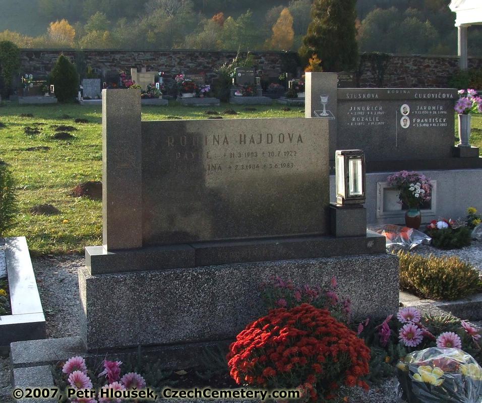 In front: Pavel Hajda, *31.3.1903 - †20.7.1972 Karolina Hajdová, *2.3.1904 - †5.6.1983 | Neighbouring graves: Jindřich Štusek, *4.3.1902 - †4.3.1969 Rozálie Štusková, *8.2.1893 - †19.1.1979 Jaromír Čukovič, *9.12.1950 - †28.3.1996 František Čukovič, *3.5.1918 - †16.3.2003 |